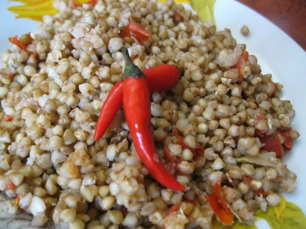 Зеленая гречка с помидорами, луком и чесноком