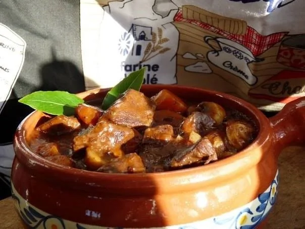 ШАГ 8 Прогреть на огне кастрюлю с толстым дном, влить красное вино. Переложить содержимое сковородки в кастрюлю, убавить огонь, накрыть крышкой и тушить мясо не менее двух часов, добавляя понемногу бульон.