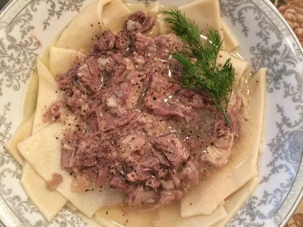 ШАГ 3 В бульон кидаем ромбики в том количестве в котором необходимо, т.е. порционно и отвариваем до готовности. Подавать бешбармак необходимо в глубокой тарелке, выложив ромбики теста, сверху мясо и добавить немного бульона.