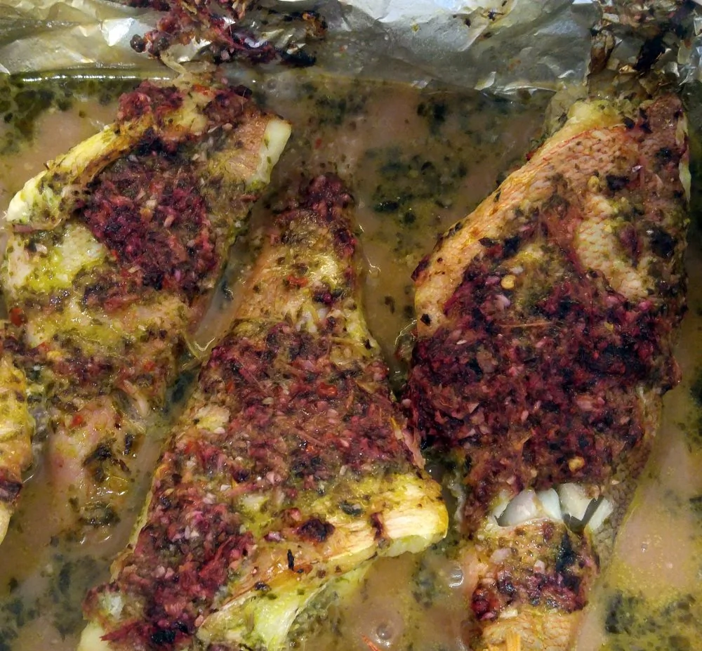 Красный морской окунь запеченный с лимонно-базиликовым соусом