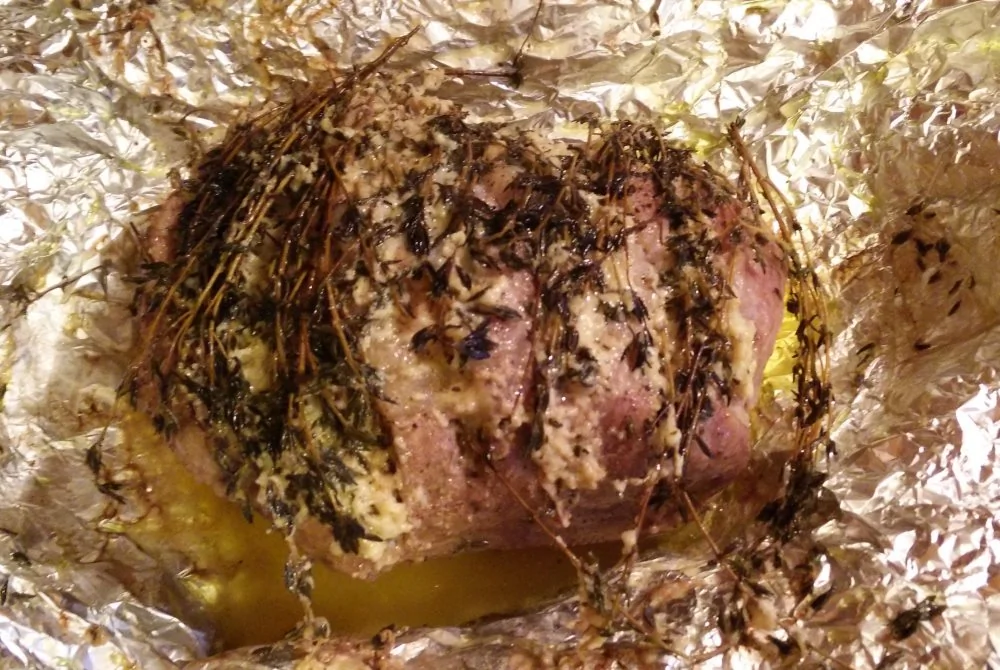 ШАГ 4 Сверху мяса кладем тимьян по всему периметру, заворачиваем в фольгу и отправляем в духовку на 1,5 часа при температуре 165 градусов.