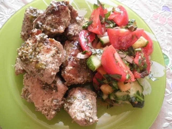 ШАГ 1 Мясо нарезать на крупные куски. Зелень (желательно, чтобы присутствовали пять видов) мелко нарезать и перемешать.