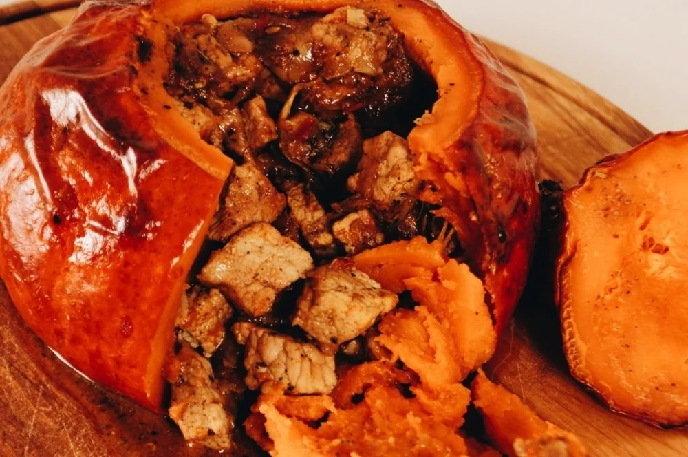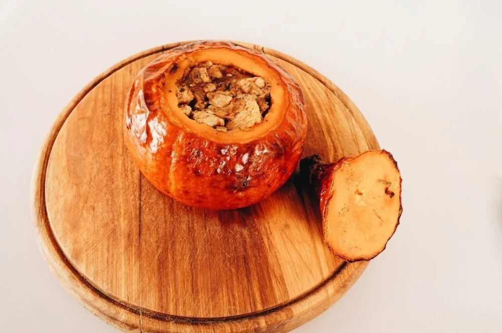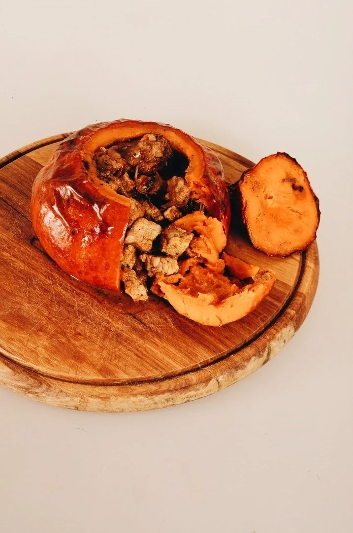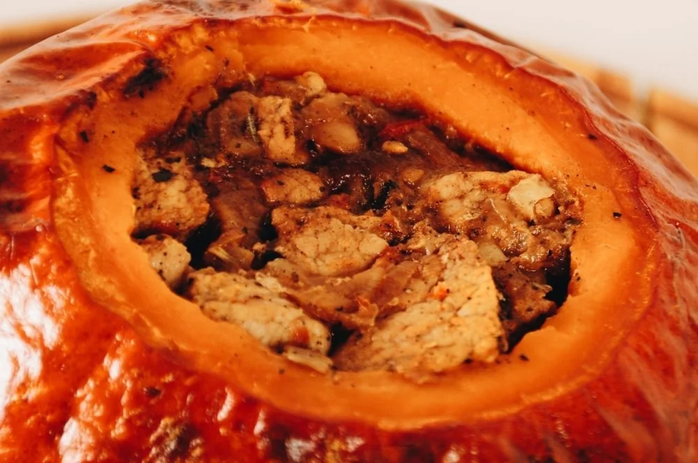 ШАГ 5 Вытащить тыкву, аккуратно нафаршировать мясом, накрыть «крышкой».