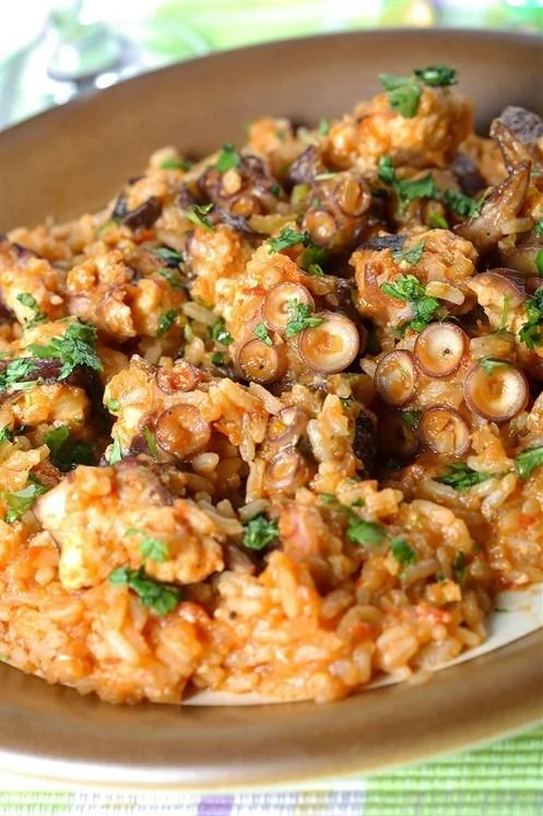 ШАГ 6 Готовить еще около трех минут, затем на тарелке смешать рис с кальмарами и подавать на стол.