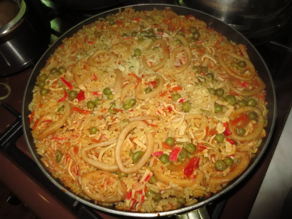 Ингредиенты для приготовления Паэлья с кальмарами в пиве: