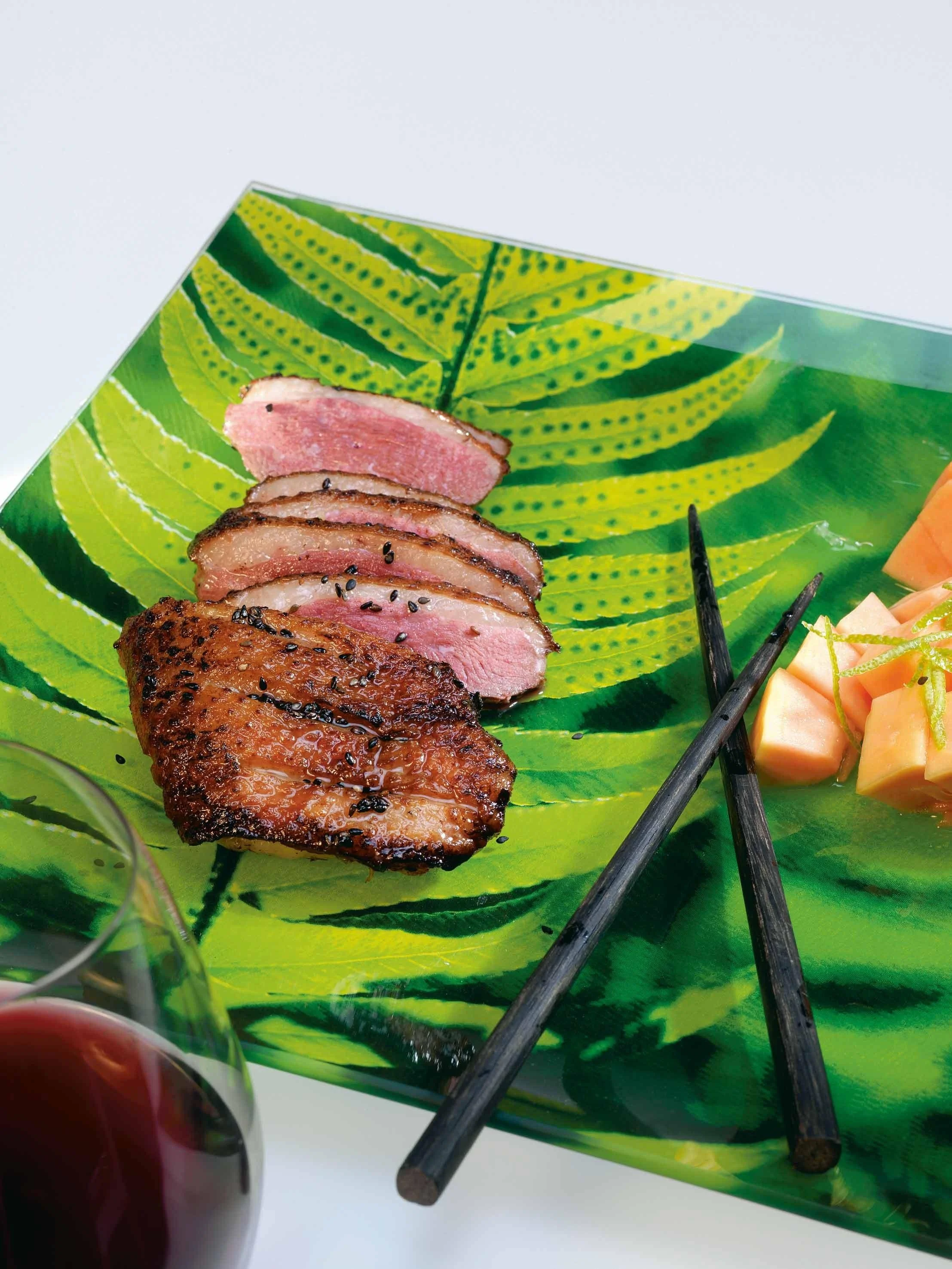 ШАГ 4 Утку вынуть из сковороды, слить из сковороды лишний утиный жир, грудку смазать медом и обвалять в кунжутных семечках. Обжарить еще пару минут, теперь уже со стороны мяса без шкурки. Потом нарезать тонкими ломтиками, залить соусом и подавать с папайей.