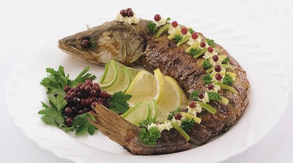 ШАГ 8 Приготовленную рыбу выложить на блюдо, разрезать на порционные кусочки и украсить салатом, помидорами, зеленью и оливками.