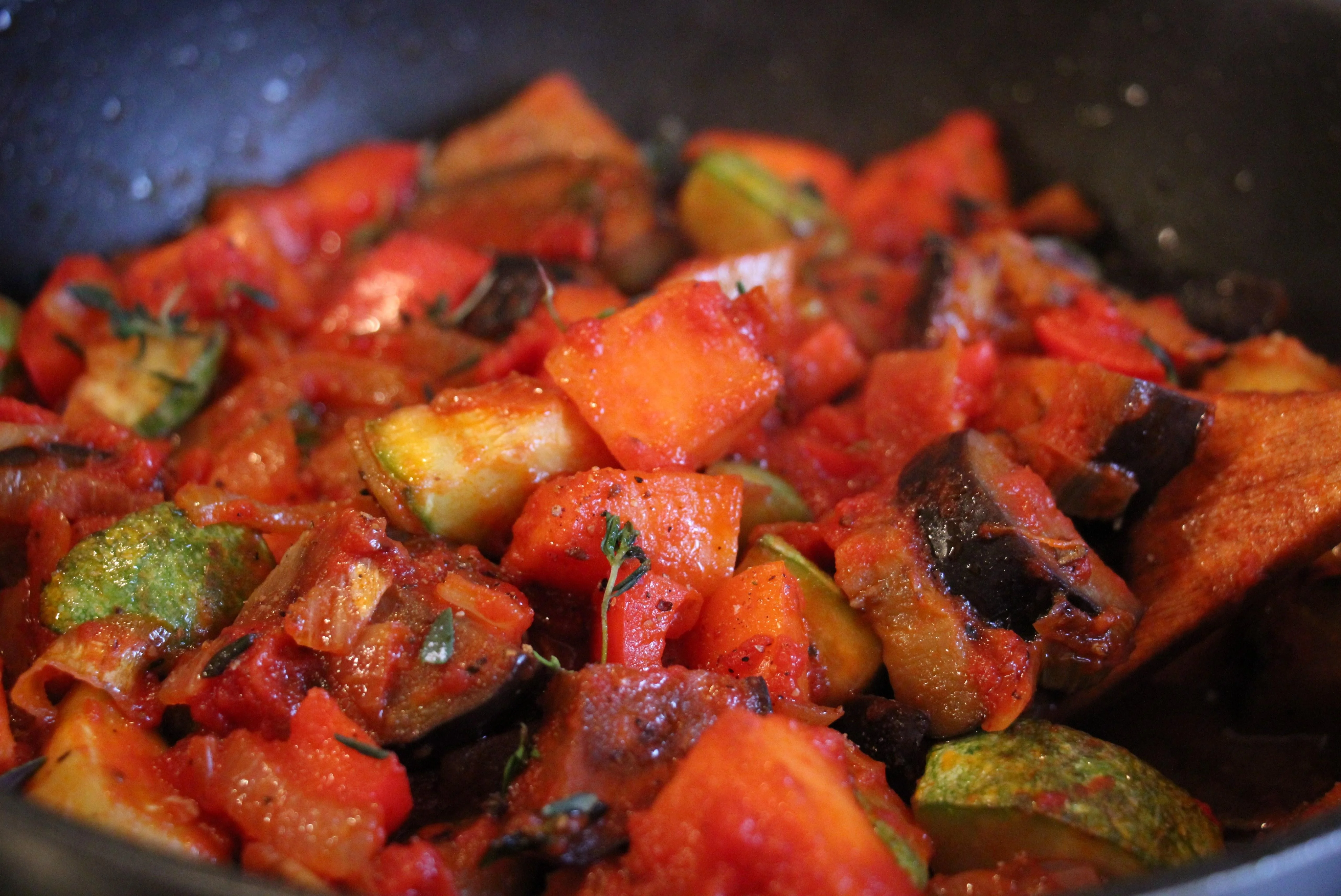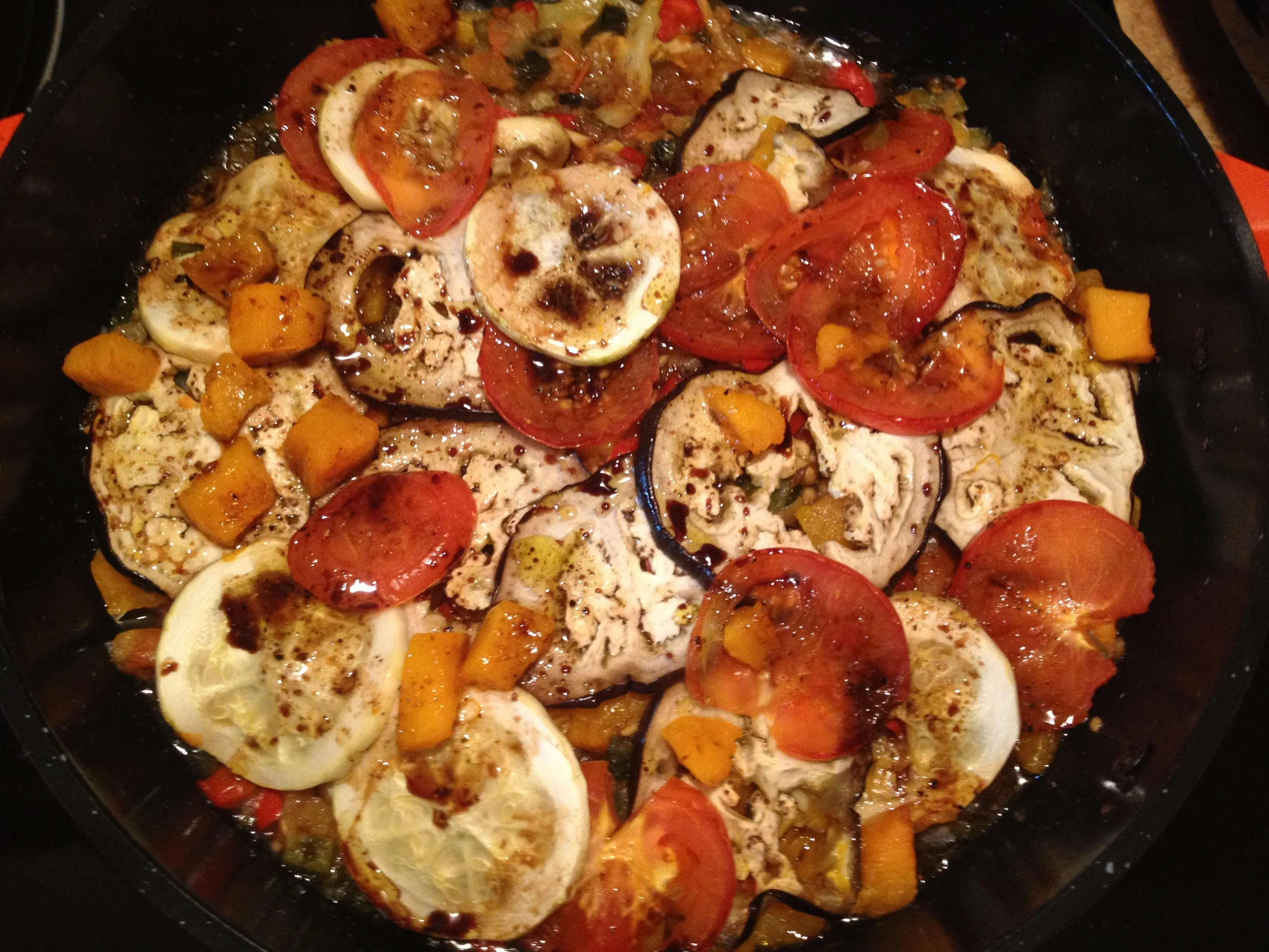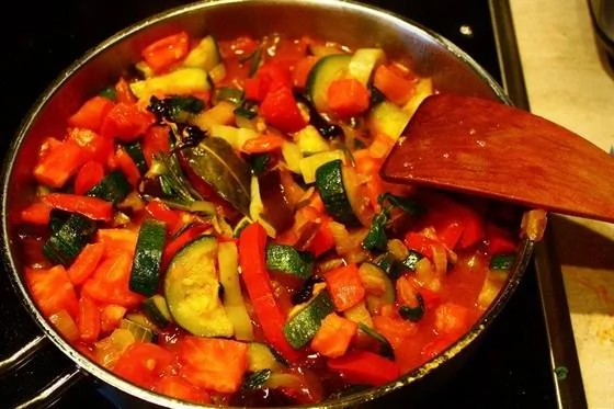 ШАГ 3 Добавить нарезанные перцы и тушить, помешивая, все вместе еще пять-семь минут. Пока перцы не станут мягкими настолько, чтобы их можно было легко раздавить деревянной лопаткой. Посолить, поперчить, перемешать с нарубленной петрушкой и снять с огня. Нарезать баклажаны, цукини, тыкву сквош, оставшиеся три помидора кружочками. На дно глубокого противня влить немного перечно-томатного соуса и уложить слой овощных кружков, чередуя баклажаны с помидорами и цукини. Полить сверху слоем соуса и уложить сверху очередной слой кружков. И так до тех пор, пока есть овощи и не кончился соус. Запечатать противень фольгой.
