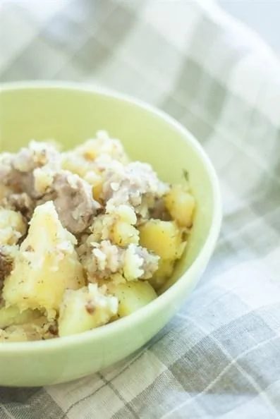 ШАГ 2 Пока жарятся желудки, чистим картошку и режем ее довольно большими кусками. Кладем картошку, добавляем майонез, перемешиваем, если мало воды — доливаем (только немного), солим, накрываем крышкой и еще тушим минут 15–20 (до готовности картошки). Выключаем и даем постоять минут 10.