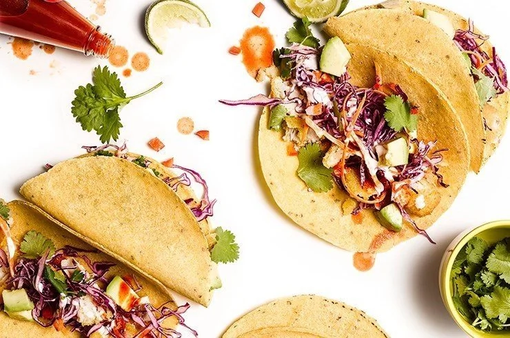 Сметана 10%-ная Легкий майонез Лимонный сок Соус табаско Чеснок Уксус Измельченная листовая капуста Морковь Авокадо Растительное масло Кукурузные лепешки Лайм Перец черный молотый Крабовые палочки Сахар Основные блюда Мексиканская кухня