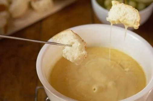 ШАГ 1 Сыры натереть и смешать в горшке, поставить горшок на средний огонь, добавить молоко, масло и яйца, приправить, довести до кипения, постоянно помешивая. Затем поместить горшок на горелку. Макать кусочки белого хлеба или грибы.