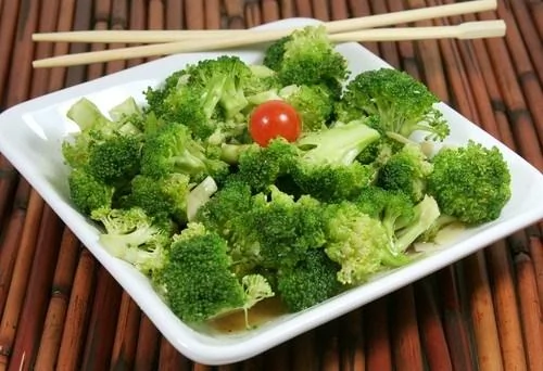 Молодая капуста брокколи с заправкой из перца чили, лайма и кунжута