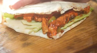 ШАГ 3 Смазать 1 сторону лепешки оливковым маслом, завернуть в нее мясо, дольки помидоров, листья салата и болгарский перец.