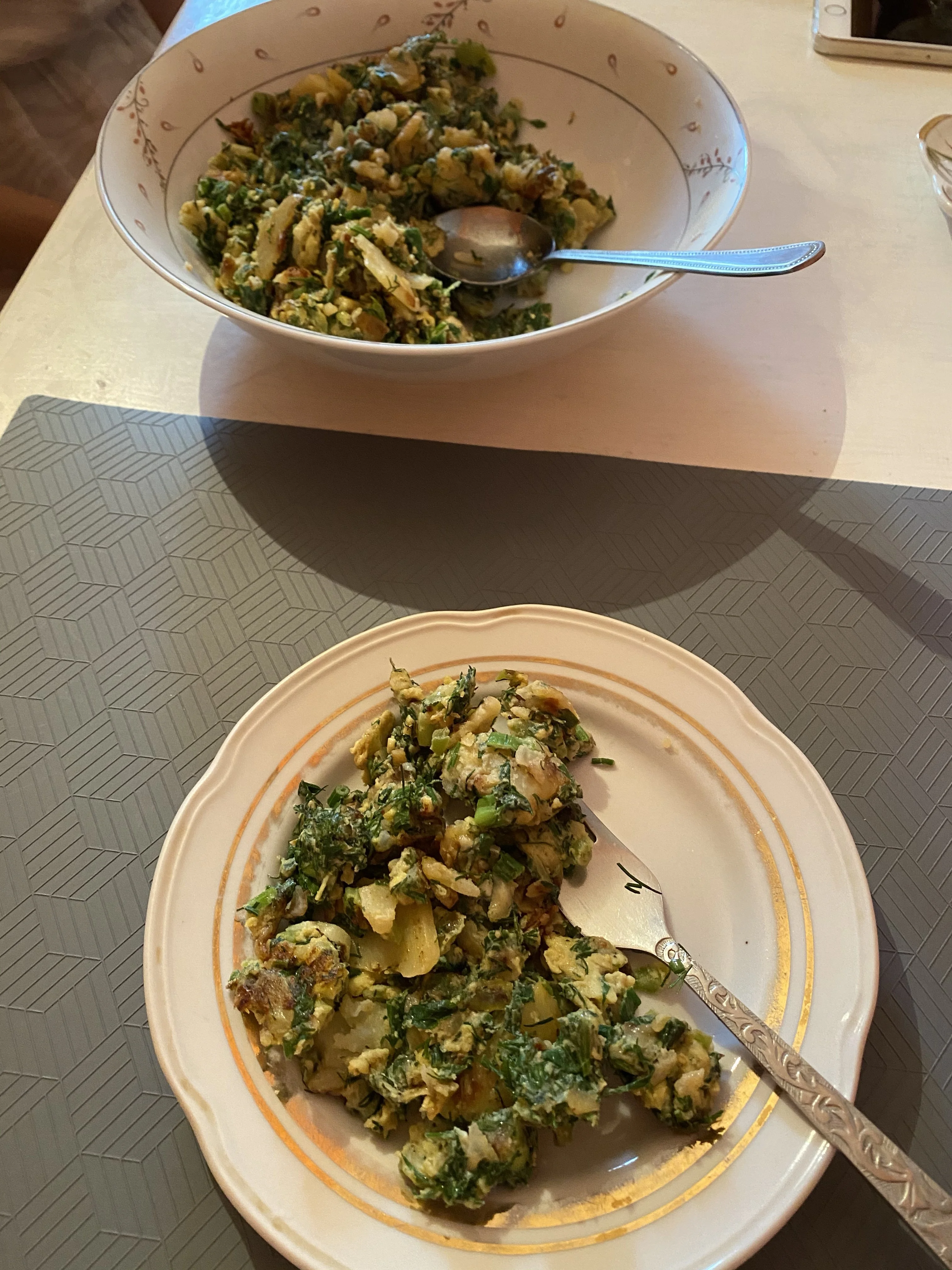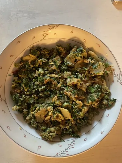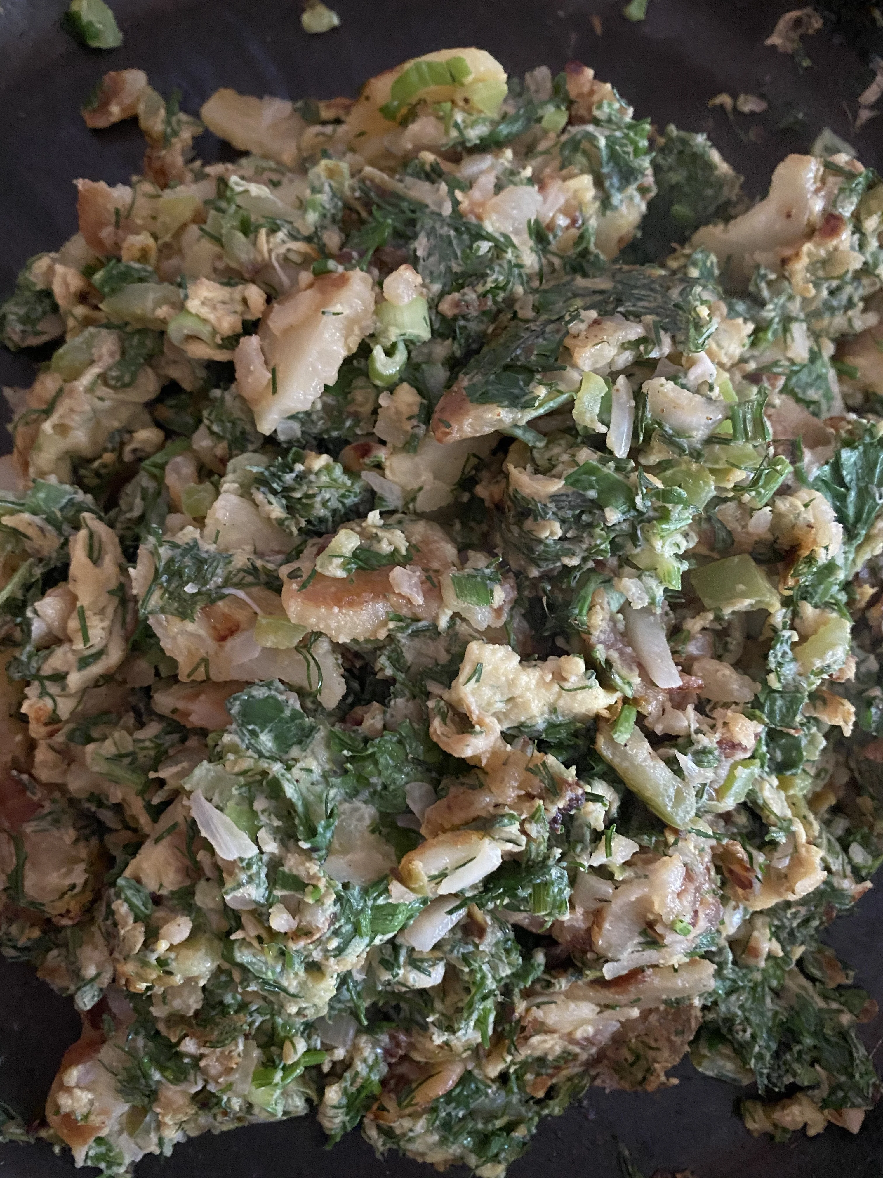 ШАГ 4 Вилкой взбить яйца вместе с зеленью и солью.