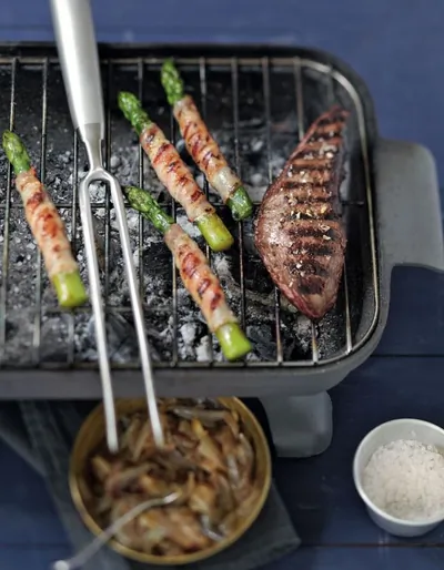 ШАГ 5 Развести огонь под барбекю. Выложить на одну сторону решетки онглеты, а на другую – спаржу в беконе. Обжаривать мясо по 4–8 минут с каждой стороны, а спаржу – по 4 минуты с каждой стороны. Посолить и поперчить онглеты в конце приготовления. Подавать с шалотом конфи.