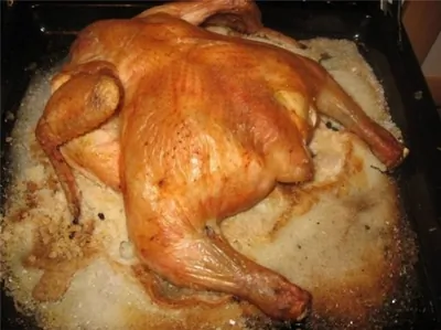 ШАГ 2 На противень высыпать всю соль и собрать из нее такой диаметр, чтобы было чуть больше самой курочки, далее на эту соль выложить курицу животом вниз. Убрать в слегка разогретую духовку примерно на час и пять минут ( ориентируйтесь по вашей духовке).