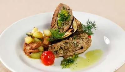 ШАГ 5 Готовую телятину нарезать крупными кусками. Можно подавать с салатом и жареным картофелем.