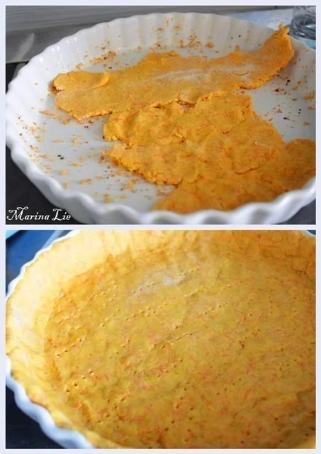 ШАГ 6 Тщательно перемешать начинку, добавить соль, перец, травки по вкусу и вылить на корж и поставить в духовку на 30 мину, 180 градусов. Дать немного остыть.