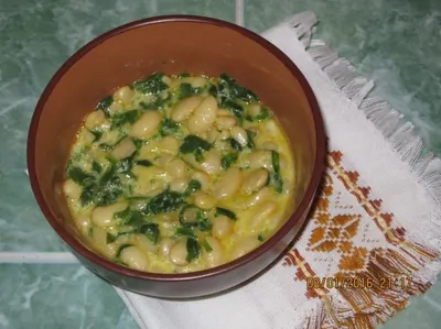 ШАГ 3 В кастрюле разогрейте оливковое масло и обжарьте в нем мелко нарезанный чеснок. Добавьте бульон (куриный или овощной), шафран и шпинат. Добавьте фасоль, сливки, а также соль, перец и паприку по вкусу. Перемешайте. Варите на слабом огне, периодически слегка помешивая еще примерно 10 минут.
