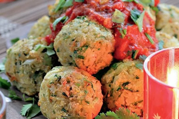 ШАГ 6 Обжаренные шарики выложить на бумажное полотенце, чтобы впитался лишний жир, затем залить томатным соусом и немедленно подать, посыпав оставшейся зеленью.