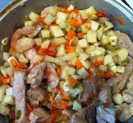ШАГ 6 Если нужно — периодически подливаем доведенную до кипячения в чайнике воду, чтоб вода еле заливала наше блюдо. Тушим до готовности картофеля, и после всего этого процесса у Вас должно получиться вполне пригодное для употребления в пищу азу по-татарски!