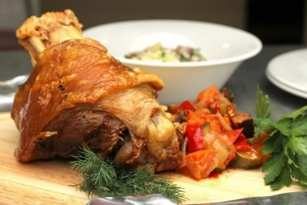 Запеченная свиная рулька с обжаренным картофелем и тушеной квашеной капустой