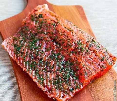 ШАГ 2 Нарезать филе кусками под размер контейнера, в котором будет солиться форель — пластиковый вполне подойдет — и посыпать каждый из них измельченным укропом и слегка раздавленным розовым перцем.
