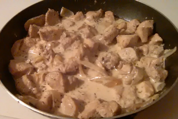 ШАГ 3 Когда лук будет готов, выкладываем к нему курицу вместе с соусом, пересола не боимся. В том случае если соли покажется мало, выровнять её вкус лучше в самом конце готовки.