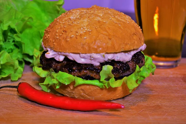 Булочка для гамбургеров Говяжий фарш Соль Молотый черный перец Перец чили Сливки 20%-ные Большие оливки без косточек Зеленый салат Красный лук Бальзамический уксус Основные блюда Гамбургер