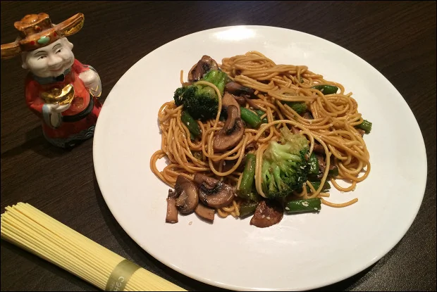 ШАГ 1 Отварить яичную лапшу в кипящей воде до полуготовности согласно инструкции на упаковке (минуты четыре). Отбросить лапшу на дуршлаг, обдать холодной водой; если будет готова ровно к моменту готовности овощей, то сразу в вок.