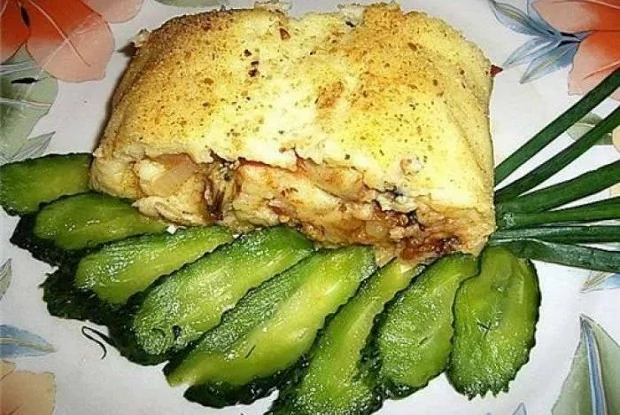 ШАГ 5 На середину массы положить фарш из мидий. Помогая полотенцем, завернуть картофельную массу в виде рулета и переложить на сковороду, смазанную жиром.