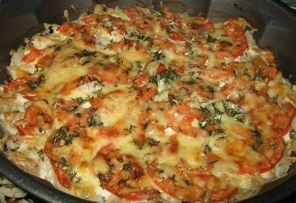 ШАГ 2 Вокруг рыбы уложить ломтики сваренного до полуготовности картофеля и рубленые помидоры, посыпать сыром и запекать в духовке до румяной корочки.