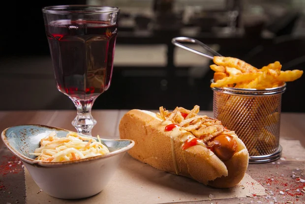 Хот-дог Лакки Лучано с салатом коул слоу и луком фри