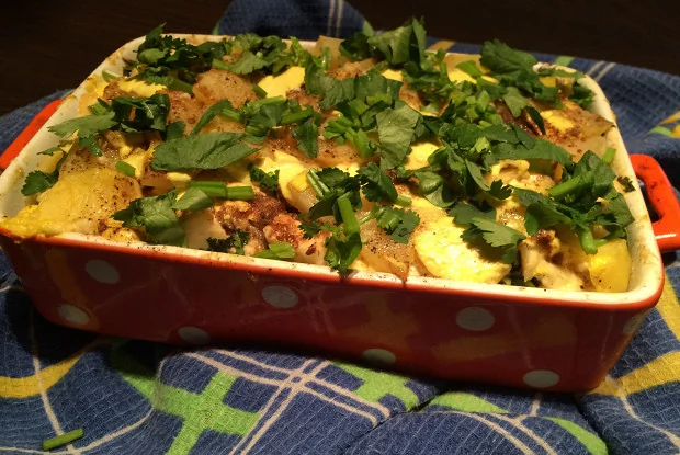 ШАГ 5 Затем заложить второй слой картофеля, специй и сыра в том же порядке, затем третий, только без зелени — оставьте её для украшения, когда будет готово.