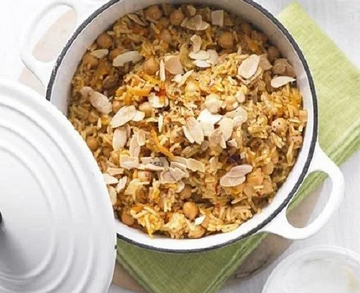 Дезодорированное рафинированное растительное масло Морковь Рис басмати Овощной бульон Нут Хлопья миндаля Сладкая паприка Асафетида Семена кумина (зира) Куркума Соль Основные блюда Европейская кухня Веганская еда Плов