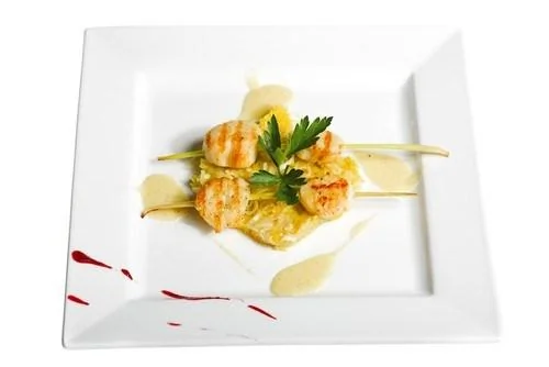 ШАГ 3 Затем куски рыбы вперемешку с кусками лука, нанизанными на шампуры, обжарить до образования корочки. Блюдо готово.
