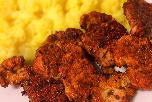 ШАГ 2 Смешать паприку, шалфей, прованские травы и черный молотый перец и тщательно перемешать специи вилкой. Обвалять каждый кусочек мяса в специях со всех сторон и оставить мариноваться в холодильнике часа на 2.