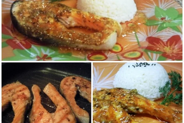 ШАГ 6 Рыбу полить карамелью, на гарнир — отварной рис.