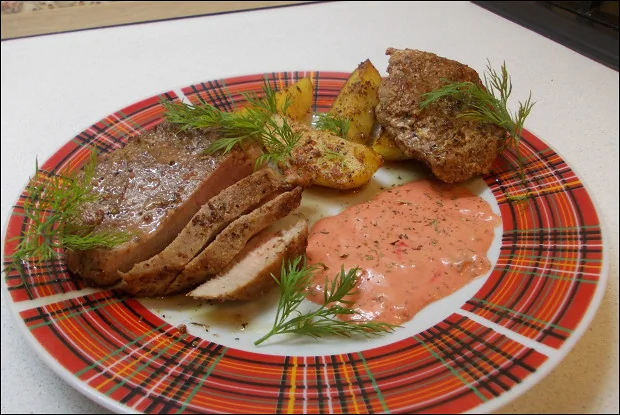 ШАГ 4 На тарелку выкладываем картофель, мясо и наш соус. можно так же добавить укроп или же петрушку.