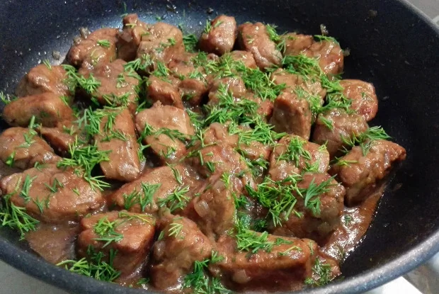 ШАГ 2 Порезанный лук добавить к мясу. Добить молотый перец и гранатовый соус. Жарить, мешая, чтобы соус хорошо впитался в мясо.
