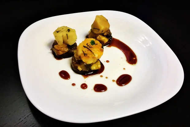 ШАГ 6 На тарелку выкладываем слоями: дольку груши, овощи, гребешок. Поливаем чуть для вкуса соусом наршараб.