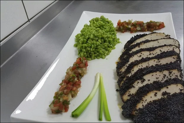 ШАГ 2 Масло оливковое и кунжутное смешать с медом и обмазать филе индейки, запанировать в маке со всех сторон.