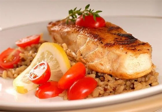 ШАГ 3 Налить соус в глубокое блюдо, сверху выложить куски рыбы, оформить ломтиками лимона и зеленью.