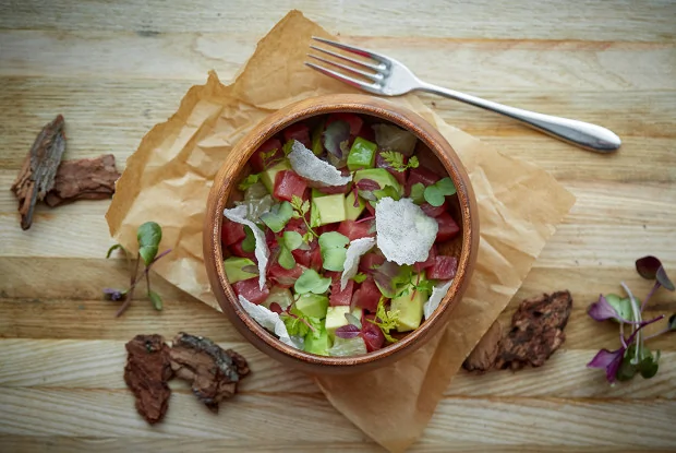 ШАГ 4 Выложить тунец, авокадо и помело в тарелку, полить соусом юзу. Сверху выложить рисовые чипсы.
