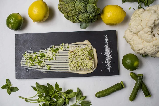 ШАГ 3 На тарелку выложить пюре из цветной капусты, на него положить рыбу, сверху присыпать мелкими соцветиями цветной капусты и перьями зеленого лука. Декорировать соцветиями разных размеров брокколи и цветной капусты.