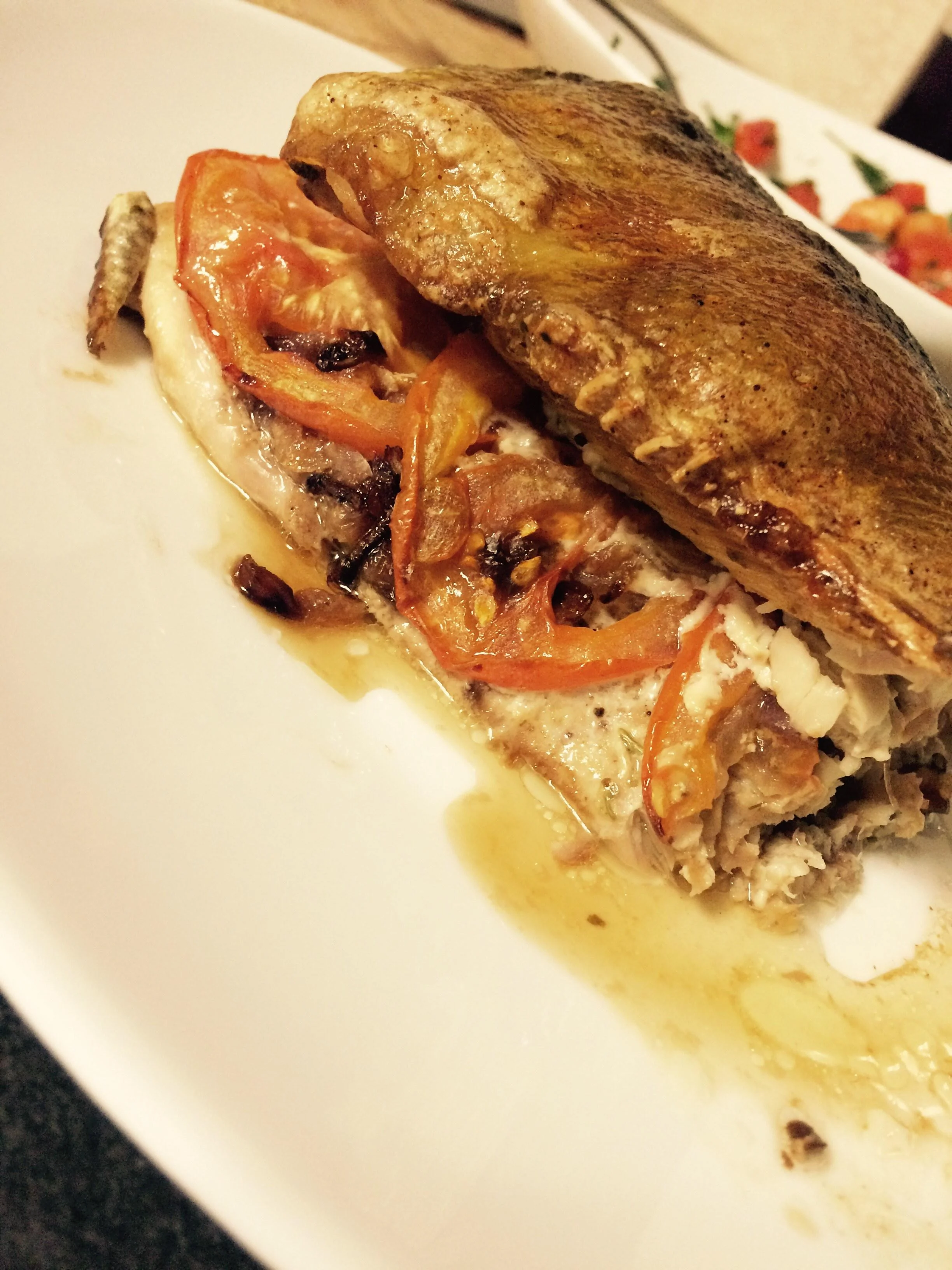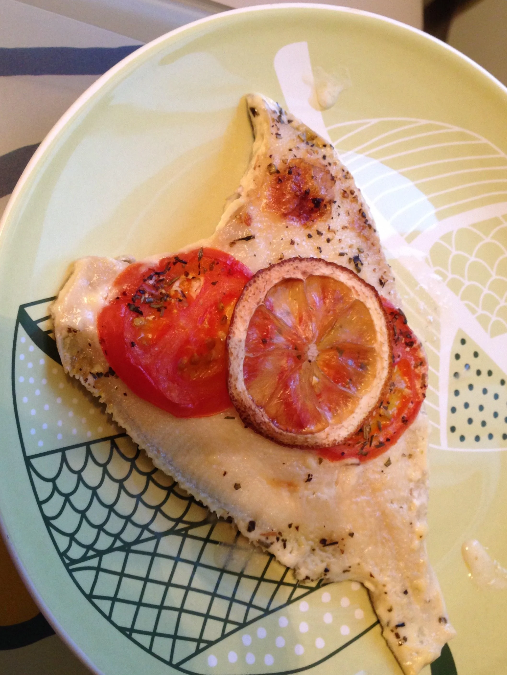 ШАГ 3 Куски филе посолите, поперчите, половину уложите в смазанную маслом форму, сверху выложите обжаренный с чесноком лук, ломтики помидора и лимона, накройте оставшимся филе. Уложите кусочки сливочного масла и запекайте при 200 градусах до готовности.