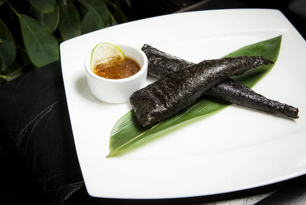ШАГ 1 Дорадо разделать на филе без костей, каждое филе разрезать вдоль пополам. Листья нори 20×20 см смазать соевым соусом до мягкости. В каждый лист завернуть четвертинку филе. Поставить в пароварку на 10 минут.