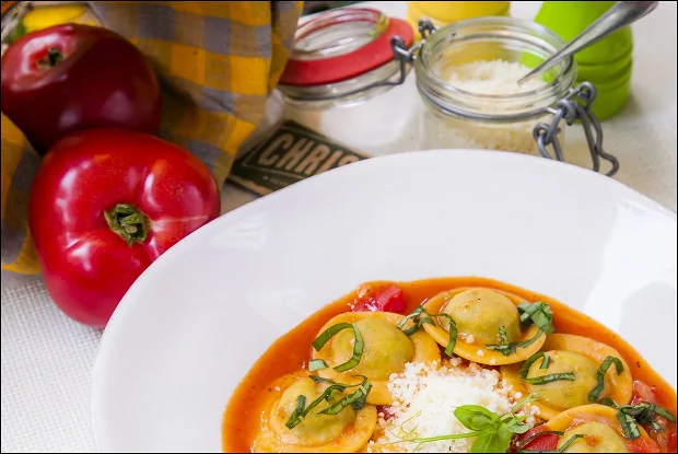 ШАГ 4 Соус для равиоли: обжарить чеснок на оливковом масле с добавлением томатного соуса и овощного бульона. Нарезать розовые помидоры средними кубиками и добавить к остальным ингредиентам. Проваривать все вместе 3-5 минут и добавить базилик.