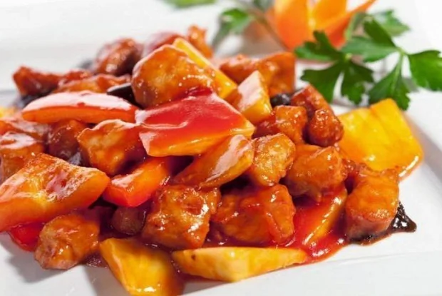 Свинина Картофельный крахмал Пшеничная мука Яичный белок Растительное масло Морковь Репчатый лук Чеснок Свежий имбирь Мед Соевый соус Молотый черный перец Соль Лимонный сок Вода Основные блюда Китайская кухня Горячие закуски