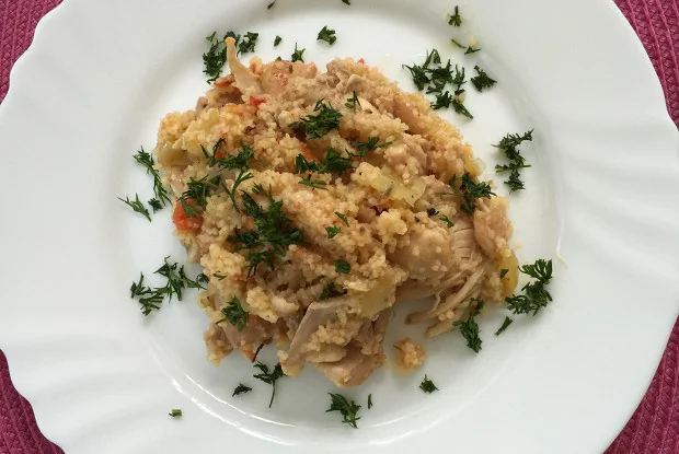 ШАГ 4 Когда жаркое дойдет до готовности (курица должна быть совершенно мягкой) — засыпаем по всей поверхности кускус, перемешиваем (так, чтобы он ушел с поверхности!)